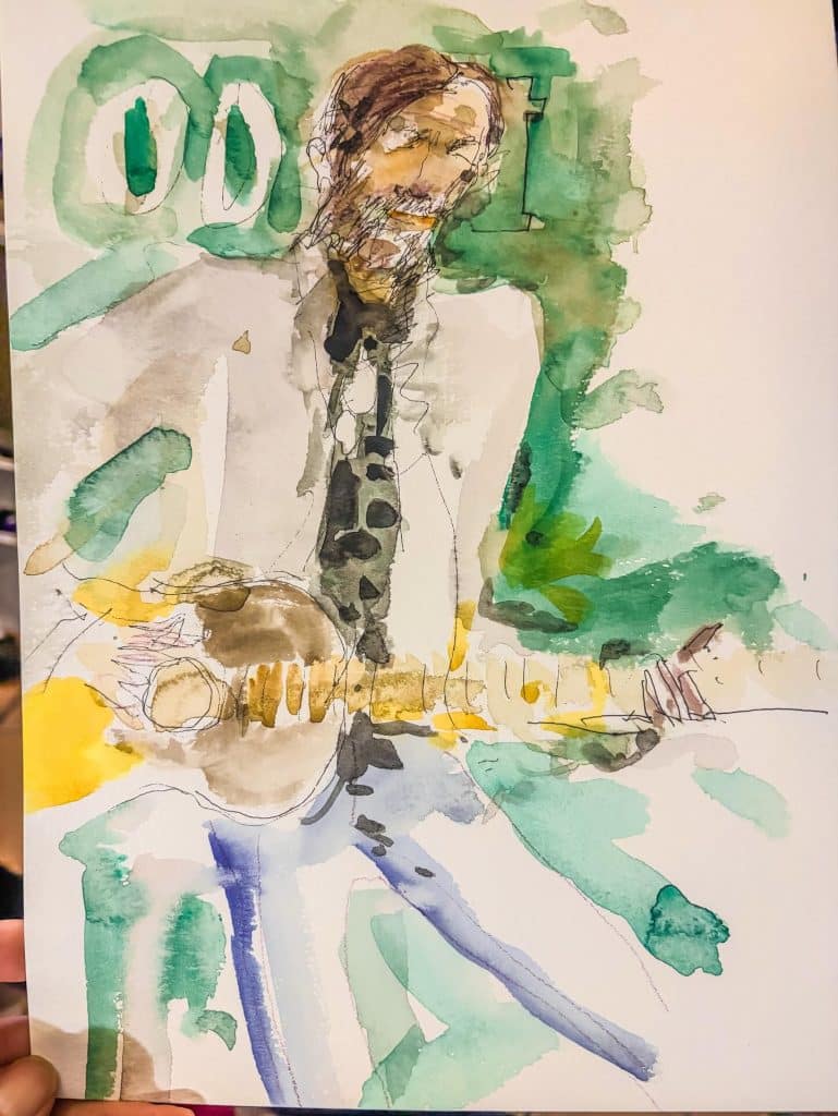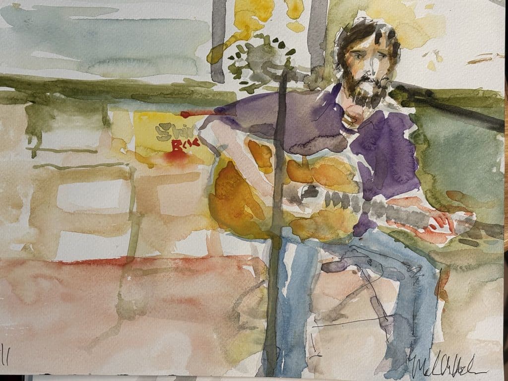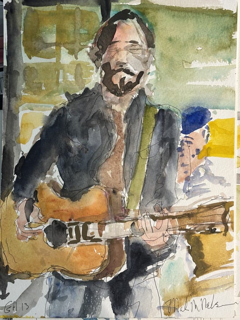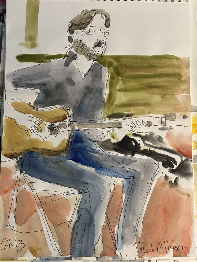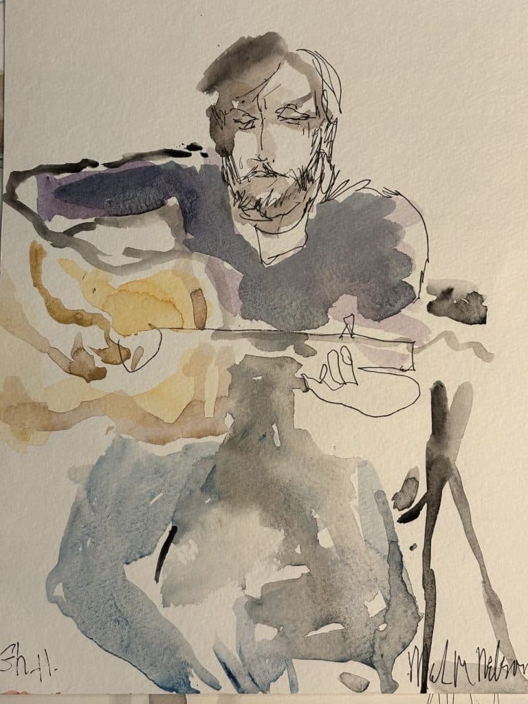 Master watercolorist Mark Nelson shared his sketch of me and of Ray Wylie Hubbard at KNBT’s Roots and Branches taping (the show airs on 1/27). I learn so much every time I see his work.